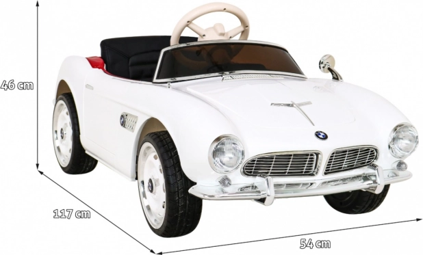 De elektrische kinderauto BMW 507 retro in het wit combineert iconisch design met praktische eigenschappen voor dagelijks speelplezier. Kinderen worden enthousiast van de authentieke grille, chromen accenten en openende deuren, die de realistische beleving versterken. De comfortabele stoel van zwarte geventileerde eco-leer met veiligheidsgordel en LED-koplampen zorgen voor stijl én veiligheid tijdens het rijden. Het maximale draagvermogen is 30 kg, de afmetingen van de auto zijn 117 × 54 × 46 cm.