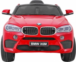 Stijlvolle elektrische kinderauto BMW X6M in gelakt rood met twee krachtige motoren 2 × 45 W, 12 V accusysteem (2 × 6 V/7 Ah), 2,4 GHz afstandsbediening met veiligheidsknop STOP en een comfortabele stoel van eco-leer met meerpuntsgordels. EVA-schuimwielen, LED-verlichting, audiopaneel met MP3/USB/AUX/TF en een soepele start zorgen voor een veilige en leuke rit.