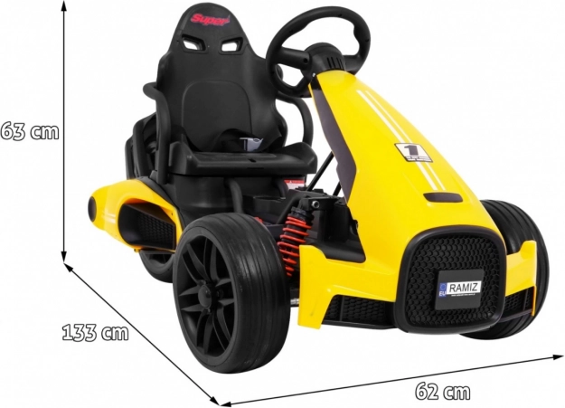 De RAMIZ XR-1 is een robuuste elektrische kinder-gokart die plezier, veiligheid en prestaties combineert. Dankzij de 2×35 W motoren en de 12 V/7 Ah accu genieten kinderen van soepel rijgedrag, terwijl de EVA schuimbanden oneffenheden dempen en stil blijven op harde ondergrond. Het stalen frame en de kwalitatieve gelagerde wielen zorgen voor een lange levensduur.