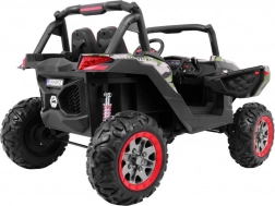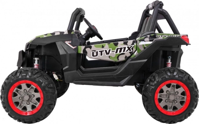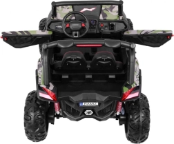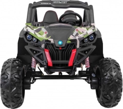 Robuuste kinderbuggy in camouflage‑design met 4x4‑aandrijving met schakelbare 2x4‑modus, touch MP4‑paneel, 2,4 GHz afstandsbediening met STOP-functie en LED‑verlichting voor een veilige en leuke rit. Grote EVA‑wielen, vering voor en achter en een eco‑leren zitje met veiligheidsgordels zorgen voor comfort, ook off‑road.