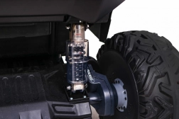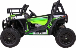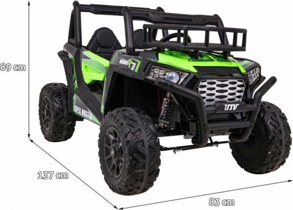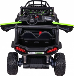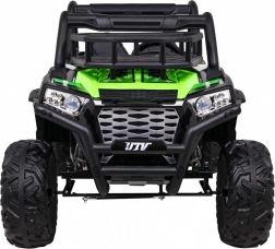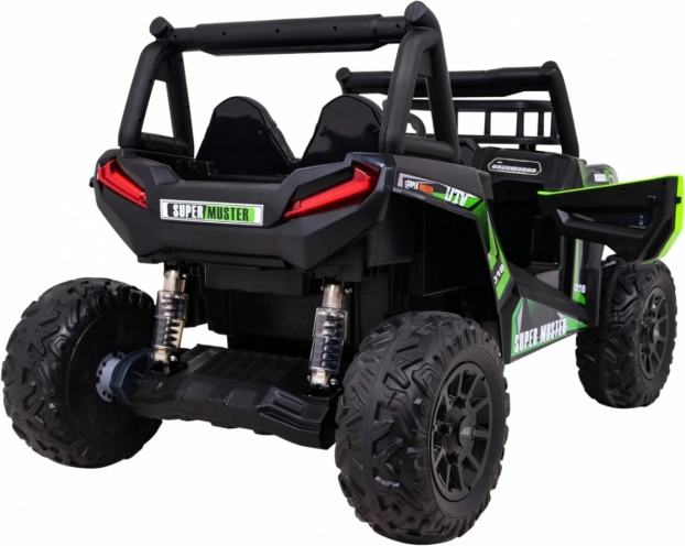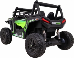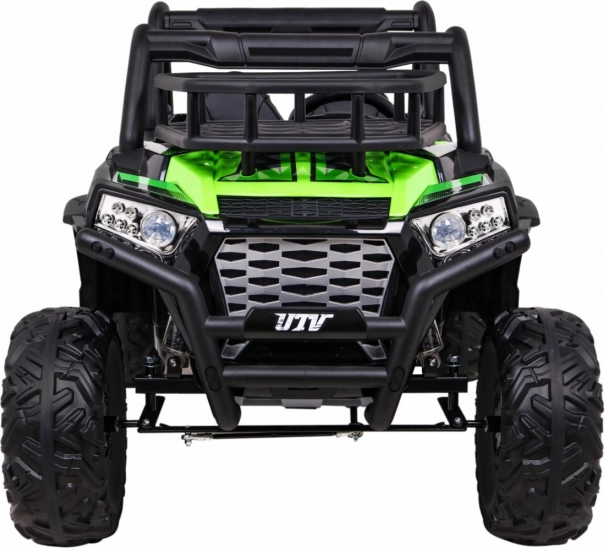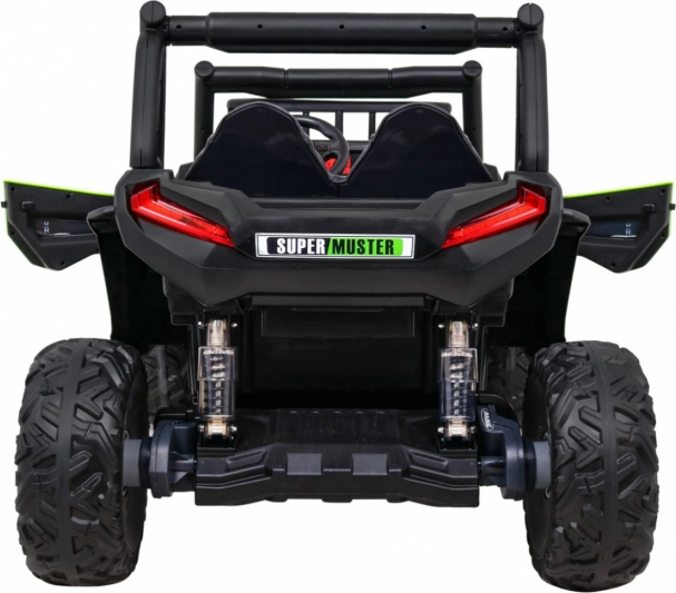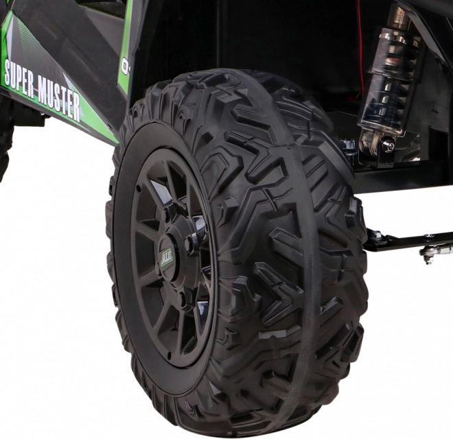 De terrein-UTV voor kinderen in aantrekkelijk groen is gemaakt voor avontuur. Twee sterke 2×200 W motoren in combinatie met een 24 V 7 Ah accu leveren genoeg kracht op ruw oppervlak. EVA-schuimwielen 34×15 cm dempen trillingen en zorgen samen met de vering 2× voor en 2× achter voor een comfortabele en stabiele rit.