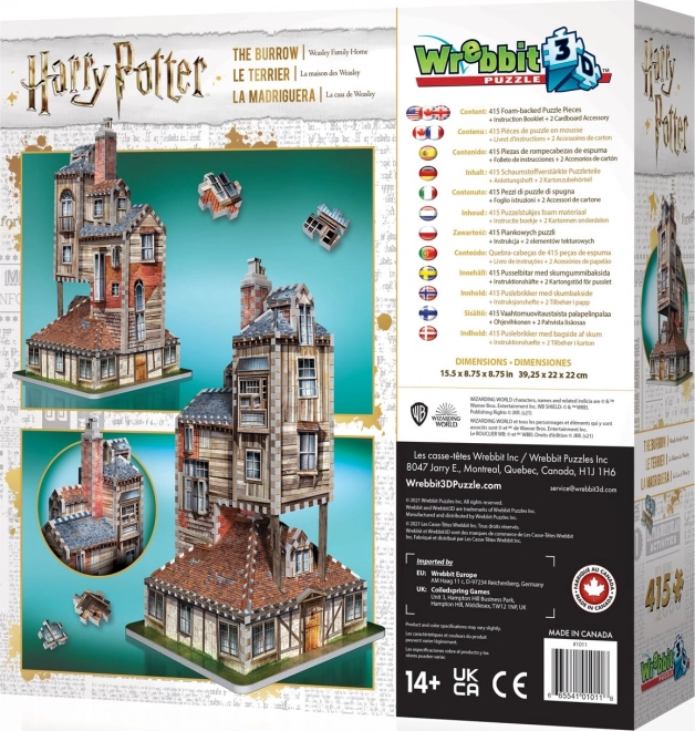 Ontdek de magie van de wereld van Harry Potter en bouw het familiehuis van de Wemels – Het Nest – als een realistisch 3D-model. Van het merk WREBBIT komt deze doordachte puzzel met 415 stevige stukjes die dankzij de slimme vormgeving stabiel in elkaar blijven zonder lijm of gereedschap. Je bouwt aan de hand van referentieafbeeldingen op de doos en een duidelijke, geïllustreerde handleiding.