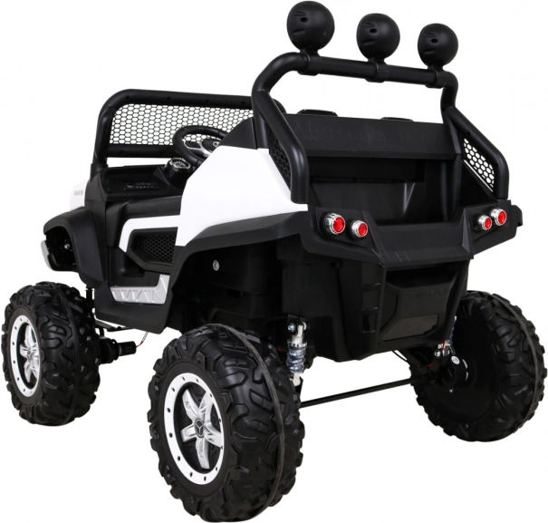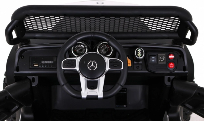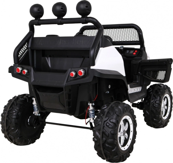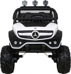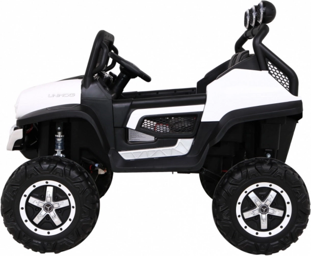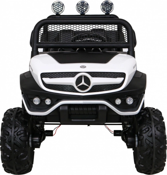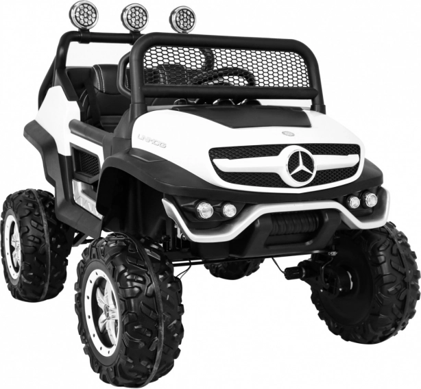 De robuuste kinderauto Mercedes‑Benz Unimog is gebouwd voor avonturen in het terrein. Dankzij vier motoren van 35 W en schakelen tussen 2×4 en 4×4 kan hij oneffenheden aan, terwijl de verstelbare vering en grote EVA‑wielen (Ø 31 cm) zorgen voor comfort en tractie. Bediening op afstand met de 2.4G afstandsbediening met drie snelheden en een veilige STOP‑knop.