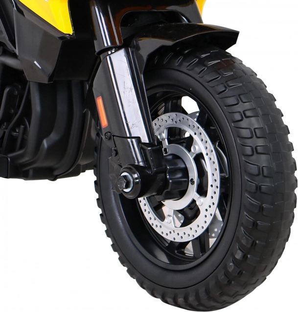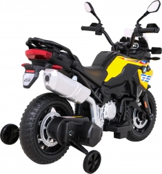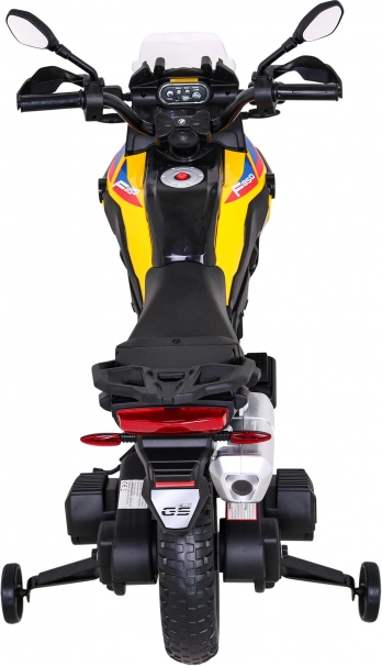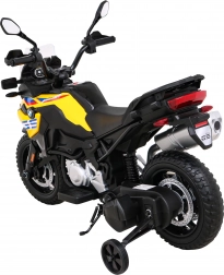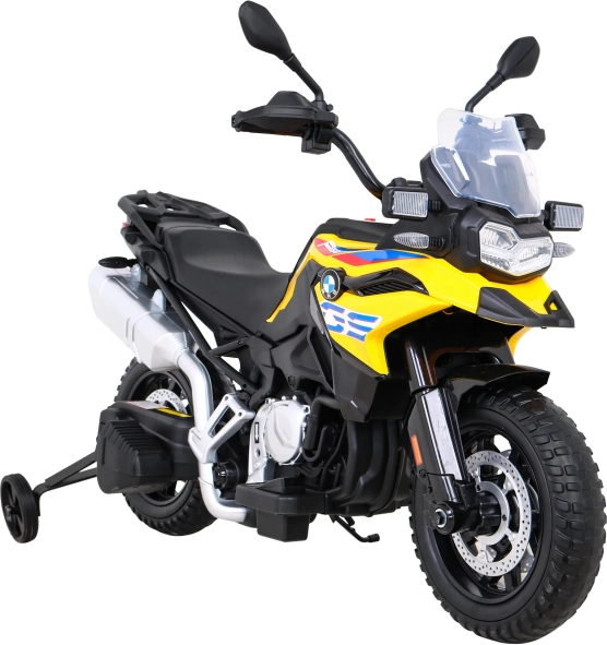 De stijlvolle elektrische kindermotor BMW F850 GS in het geel overtuigt met een realistische look, stille EVA-banden, soepele start en LED-verlichting. Dankzij de zijwieltjes is hij ideaal voor beginners, terwijl het audiopaneel met USB/AUX voor plezier zorgt bij elke rit.