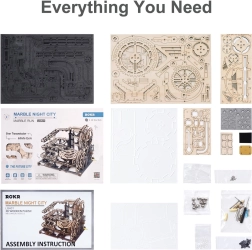 ROKR Marble Night City is een verbluffend 3D bouwmodel van een knikkerbaan dat plezier en educatie combineert. Dit model bestaat uit 294 nauwkeurig uitgesneden onderdelen die een complexe baan vormen met verschillende obstakels en handmatig aangedreven mechanica door aan een slinger te draaien. De verpakking bevat een complete handleiding die je door het bouwproces leidt.