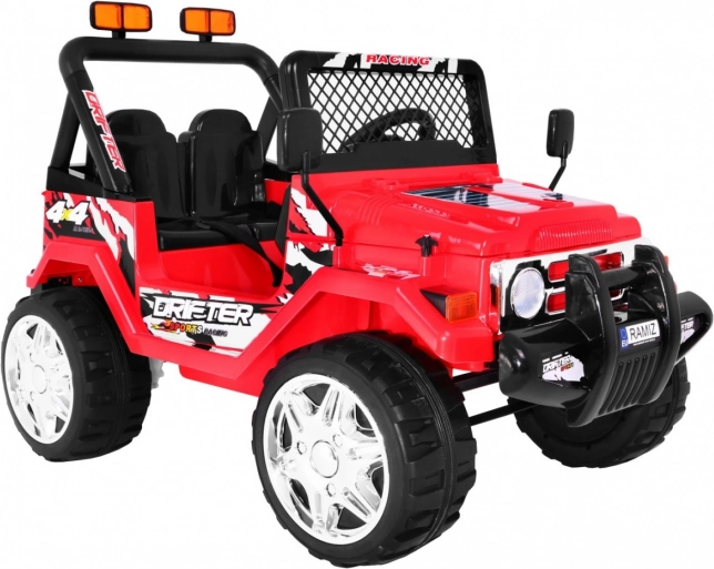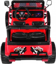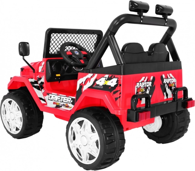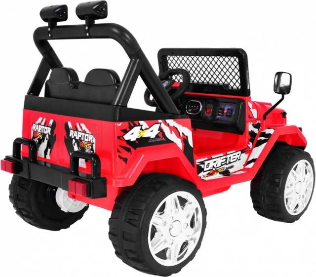 RAPTOR DRIFTER is een robuuste elektrische kinderauto geïnspireerd op offroad-design. Dankzij twee motoren van 2×45 W en accu’s 2×6 V/10 Ah kan hij oneffen terrein aan, terwijl de zachte EVA-wielen trillingen dempen en zorgen voor stil, comfortabel rijden. Soft start voorkomt rukken bij het wegrijden en de veiligheidsgordels houden de kleine bestuurder stevig in de stoel.