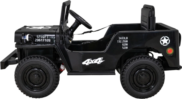 Dit zwarte elektrische kinderautootje in de stijl van een militaire jeep maakt kleine avonturiers blij met een authentieke look, werkende koplampen en een comfortabel zitje van geventileerd eco-leer. Dankzij de 4x4-aandrijving, de EVA-banden 26 × 9 cm en vering voor en achter, kan het oneffenheden en terrein rond het huis moeiteloos aan. Een soepele start en rijrichting vooruit/achteruit verhogen het comfort en de veiligheid tijdens het rijden.