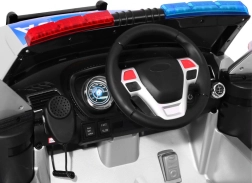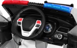 De auto is uitgerust met realistische LED-lampen voor en achter, knipperende politiezwaailichten en een rijk audiopaneel: FM-radio, MP3, SD, AUX, USB en geluiden in het stuur. Het grote hoogtepunt is de megafoon gekoppeld aan de luidsprekers en authentieke sirenes. Voor comfort zorgen onderhoudsvrije EVA-wielen, 4 schokdempers (2 voor, 2 achter) en een geventileerde zitting van eco-leer. Deur(en) die open kunnen en een transporthandgreep met extra wieltjes maken verplaatsen eenvoudig.