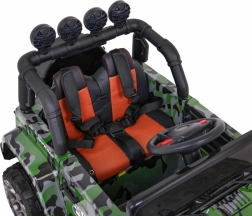 Robuuste elektrische kinderauto in 4x4-terrein design met moro lak biedt een echte rijbeleving. Uitgerust met 4 motoren, zachte EVA-wielen met lagers, LED-verlichting voor en achter en een comfortabele zit met vijfpuntsgordels. Ouders waarderen de 2,4 GHz afstandsbediening met STOP-knop en kleine bestuurders het uitgebreide audiopaneel (MP3, USB, SD, AUX).