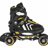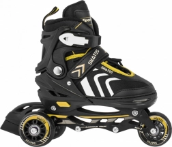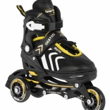 Universele 4-in-1 kinderset voor het hele jaar: inline skates, rolschaatsen en ijsschaatsen in één. Dankzij het vijfstaps maatsysteem 39–43 groeit hij met het kind mee. Een aluminium frame, ABEC-7 lagers, PU wielen 72 mm / 85A en roestvrijstalen ijzers zorgen voor een soepele rit en veiligheid. Comfort wordt ondersteund door een halfstijve constructie, ventilatie en een zachte EVA-inleg met Velvet-materiaal.
