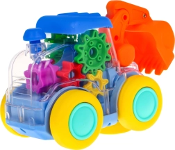 Interactieve transparante graafmachine voor kinderen vanaf 3 jaar, boordevol plezier dankzij licht- en geluidseffecten, automatisch rijden met obstakelontwijking en gekleurde tandwielen zichtbaar in de carrosserie. De beweegbare schep en het veranderen van de rijrichting bij contact met een obstakel stimuleren nieuwsgierigheid en de ontwikkeling van de fijne motoriek.