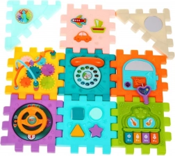 Dit kleurrijke multidak kan in verschillende vormen worden opgebouwd of uitgevouwen tot een vlakke speelmat. Dankzij de licht- en geluidseffecten van het pianootje (voeding 3× AAA, niet inbegrepen) ondersteunt het de ontwikkeling van gehoor en zicht, terwijl de mechanische elementen – stuur, telefoon, deurtje met sleutel en tandwielen – uitstekend de fijne motoriek en coördinatie trainen.