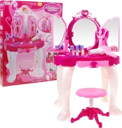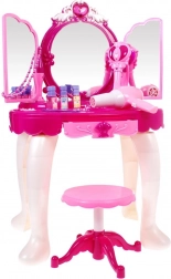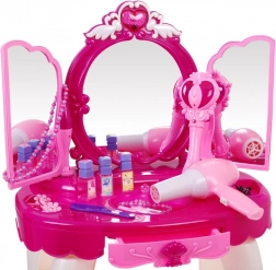 De set bevat een stabiel tafeltje, een comfortabele kruk en een rijke set accessoires voor make-up en versiering. De werkende batterijföhn maakt geluid en blaast een zacht briesje, wat het spel extra realistisch maakt. De set stimuleert creativiteit, fijne motoriek en rollenspel.