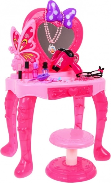 Deze roze kinderkaptafel verandert elke kinderkamer in een magisch hoekje voor cosmetica. De hartvormige spiegel is versierd met een strik met lichteffecten en een prettige melodie, die de verbeelding prikkelt tijdens het spelen van beautysalon. Inclusief een functionele speelgoedföhn met realistisch geluid en luchtstroom, waardoor het spel nog authentieker wordt.