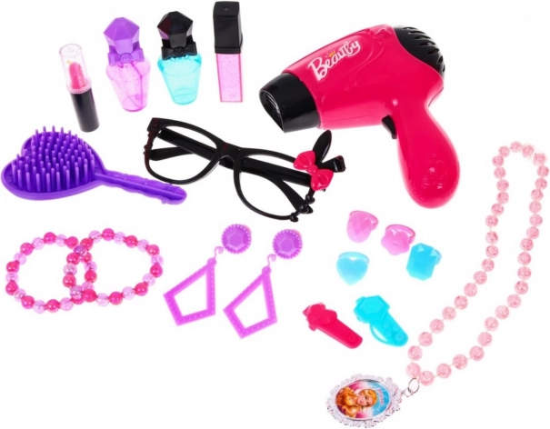 - Kaptafel, kruk, föhn, bril, kam ca. 12 × 7 cm, ketting, 2× armband, 4× ring ca. 2,5 × 2,5 cm, 2× haarspeld ca. 4 × 2 cm, imitatie lippenstift ca. 6,5 × 1,5 cm, 3× flesje ca. 7,5 × 3 cm, hanger met prinses ca. 4 × 3 cm, 2× oorbel, stickers