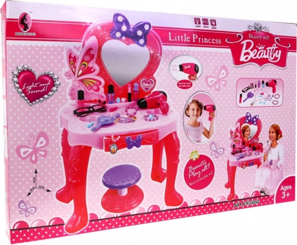 De praktische lade bergt alle spulletjes op, terwijl de meegeleverde kruk zorgt voor comfortabel zitten. De rijke set sieraden en cosmetische rekwisieten laat kinderen stijl ontdekken en stimuleert fijne motoriek en sociale vaardigheden tijdens samen spelen.