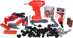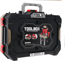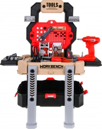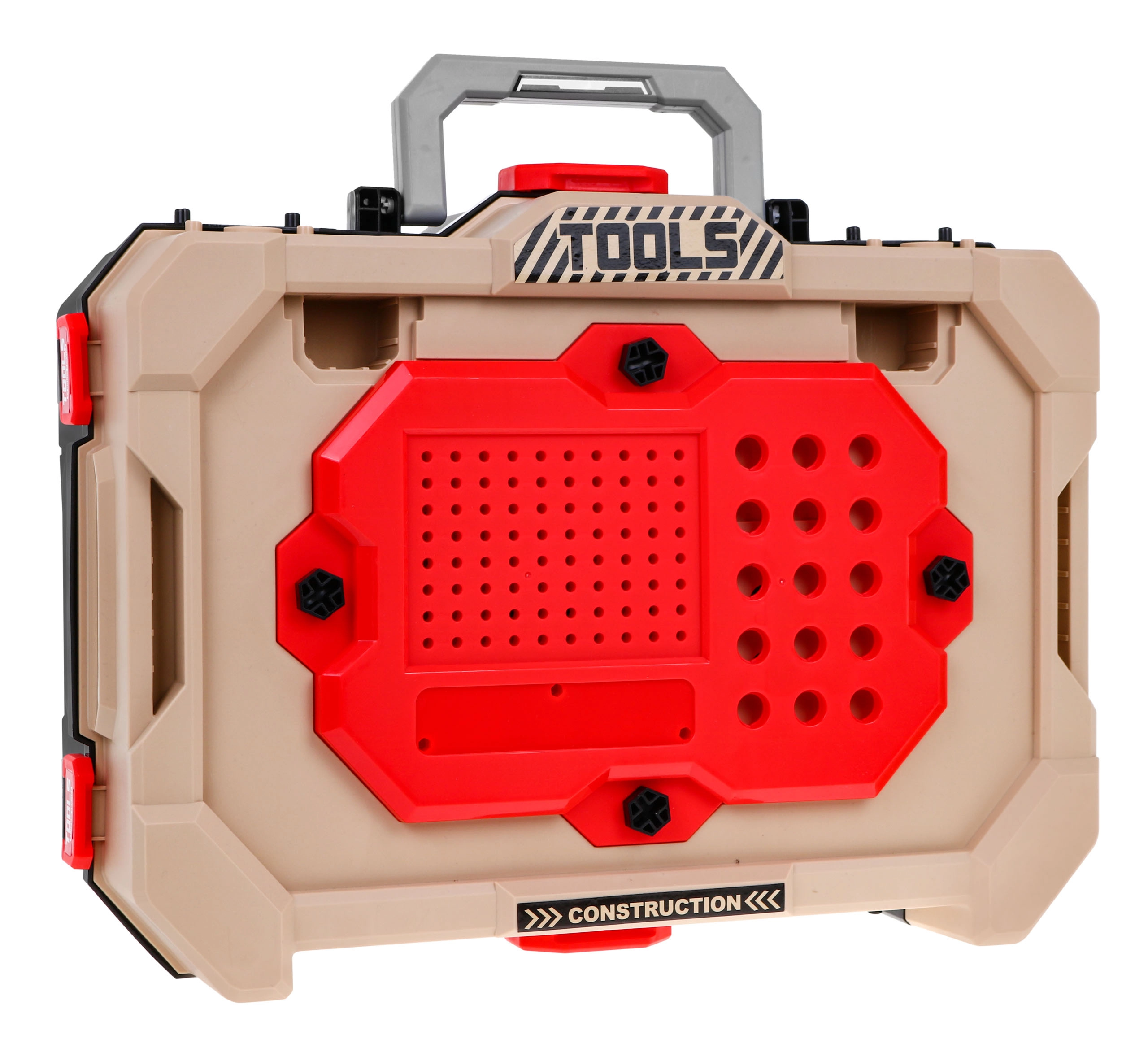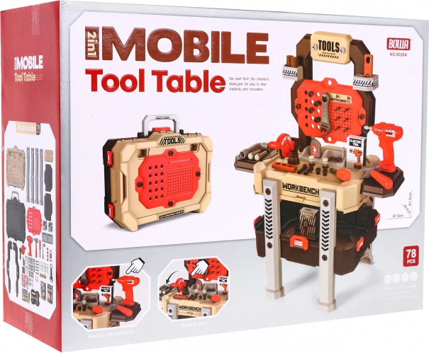 Inhoud van de set (selectie uit 78 stuks): koffer, werktafel, boor/schroevendraaier met verwisselbare opzetstukken, zaag, hamer, kruiskopschroevendraaier, steeksleutel en verstelbare sleutel, houten onderdelen, schroeven, moeren, stickers en andere accessoires.