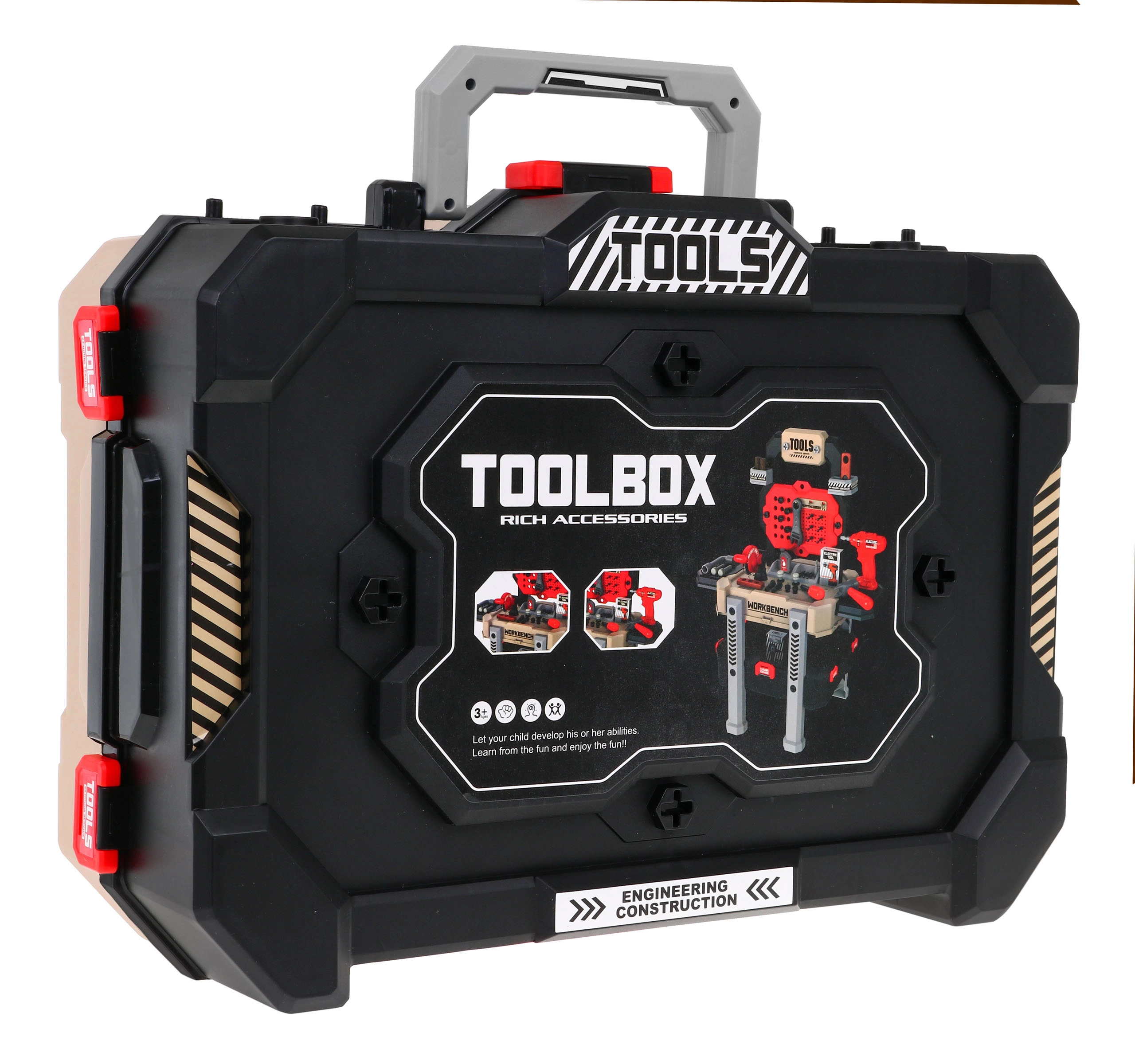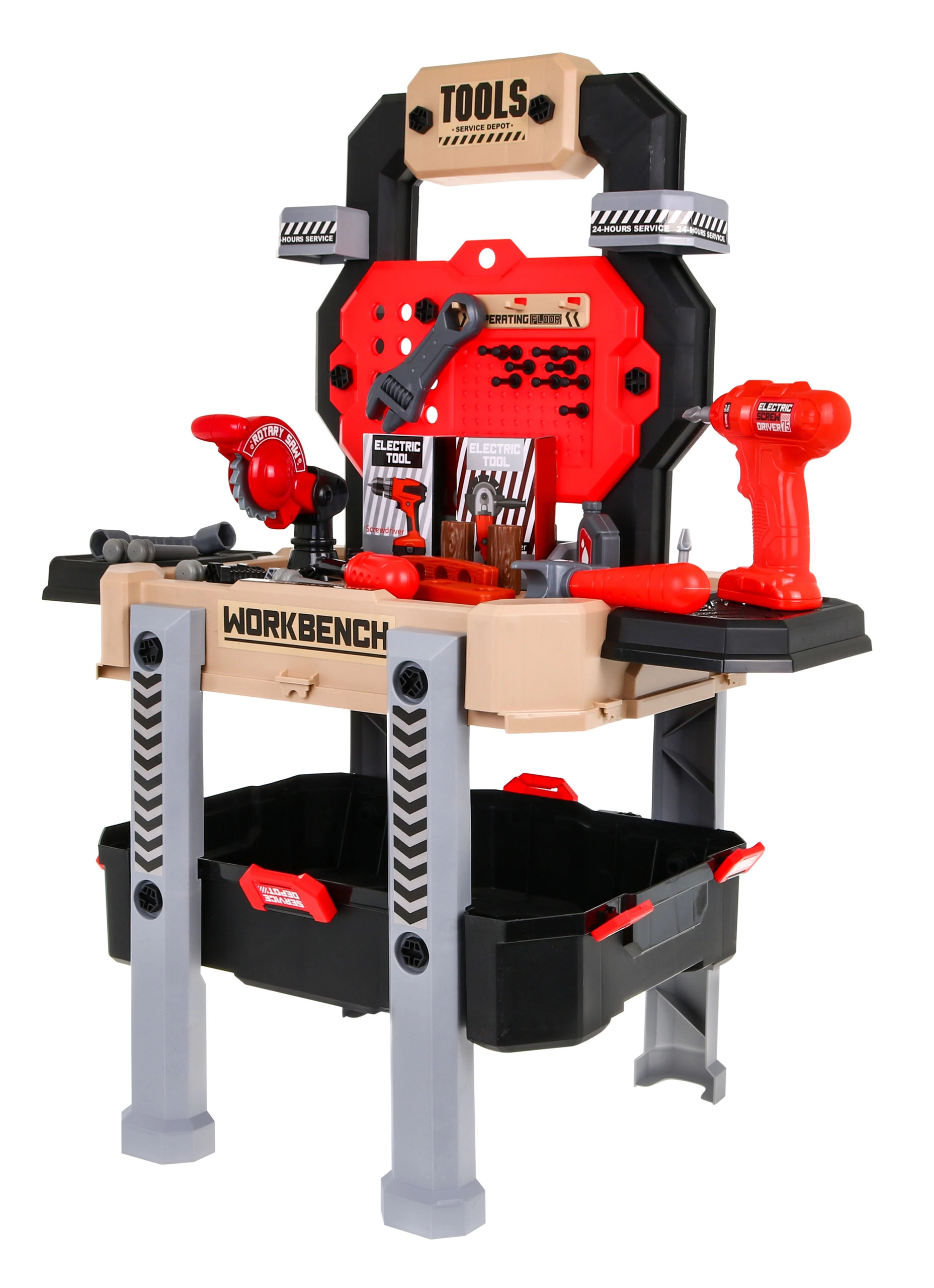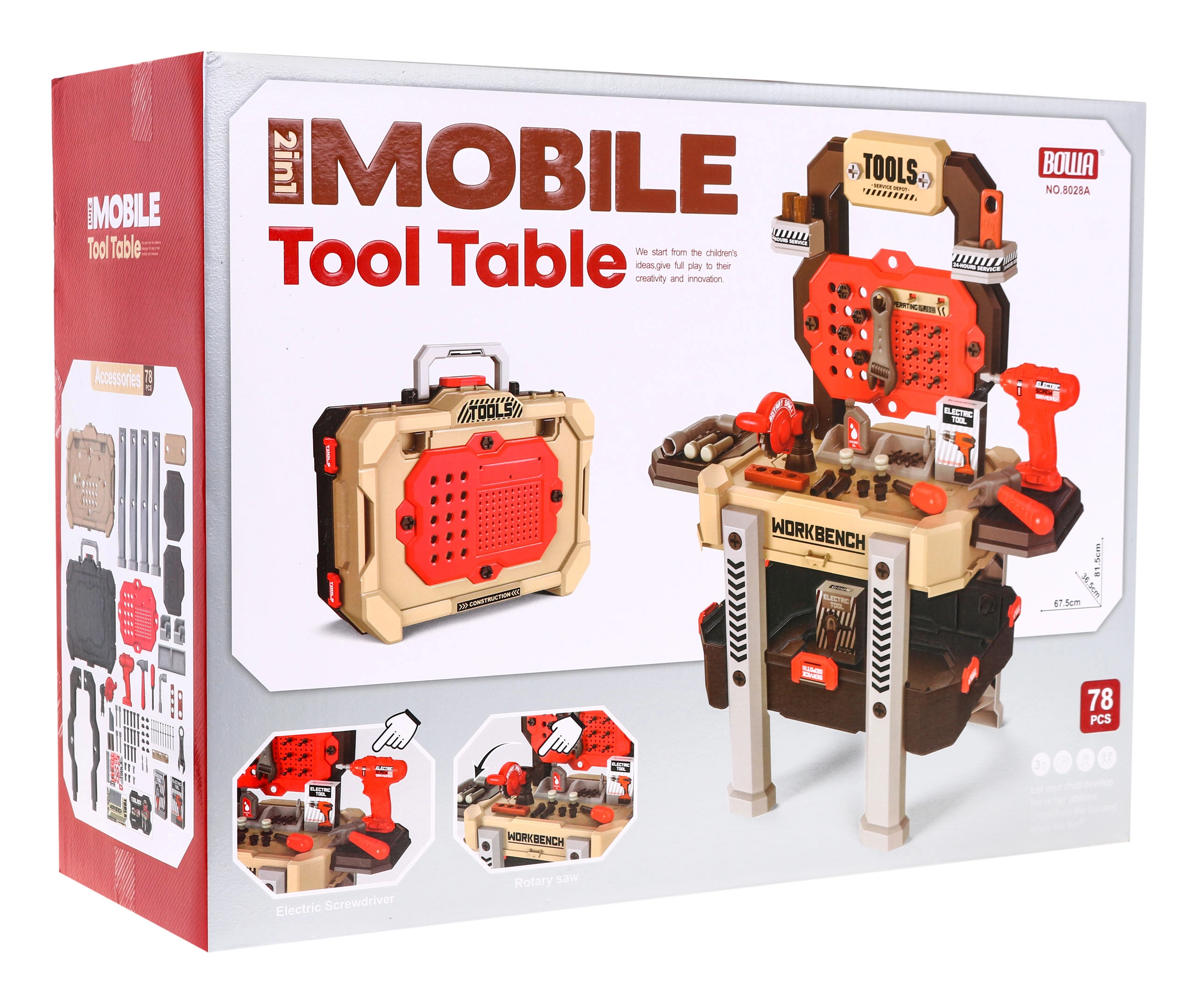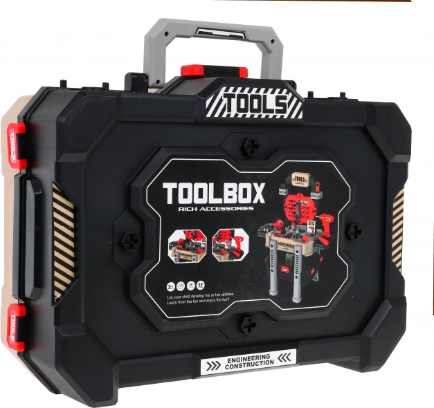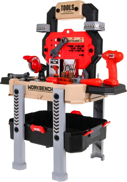 Rijk uitgeruste kinderwerkbank 2-in-1 met 78 onderdelen, een interactieve boor/schroevendraaier en een zaag zal kleine doe-het-zelvers vanaf 3 jaar verrukken. Het gereedschap kan worden georganiseerd op de praktische werktafel of alles kan worden opgeborgen in de draagbare koffer. De elektrische boor maakt realistische geluiden en heeft verwisselbare opzetstukken. Ideaal voor de ontwikkeling van motoriek, creativiteit en rollenspel.