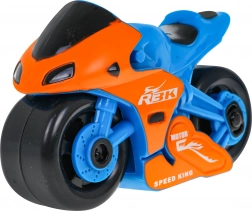 Stijlvolle motor in een combinatie van blauw en oranje met de opdruk 'Speed King' voor spannende racespellen.