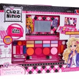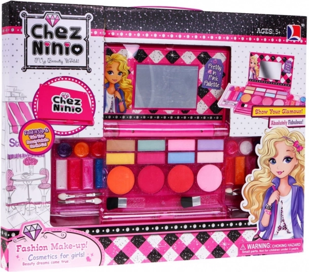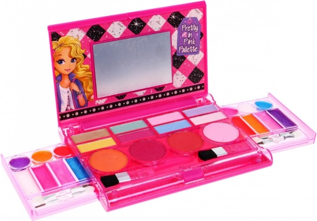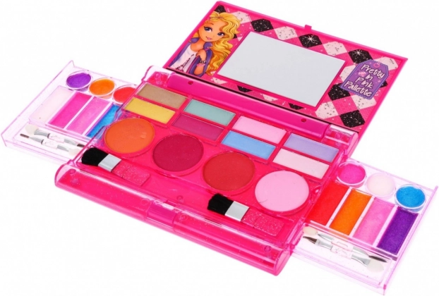 Schattig roze make-uppalet voor kinderen vanaf 5 jaar met gekleurde oogschaduws en lippenstiften, praktische kwastjes en een spiegeltje in een uitklapbaar palette. Alles is opgeborgen in een compact etui, ideaal voor op reis. Gemaakt van veilige materialen en ontworpen om creativiteit en fijne motoriek te stimuleren.