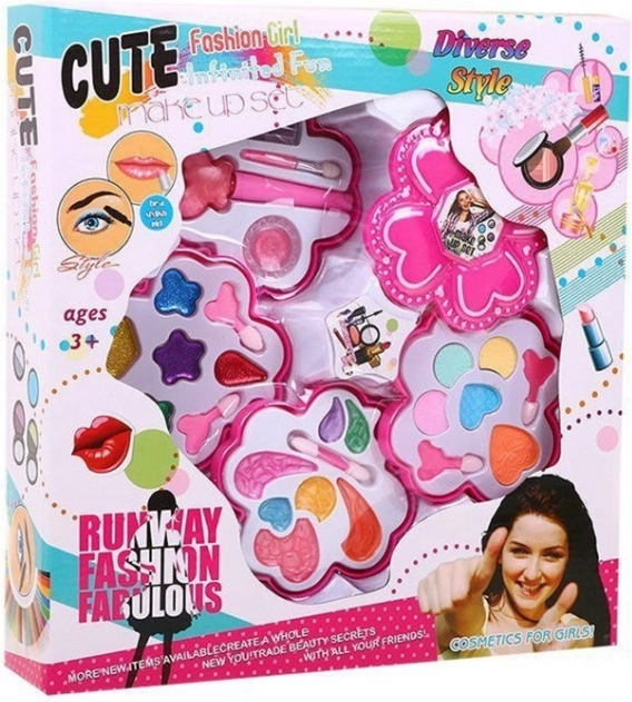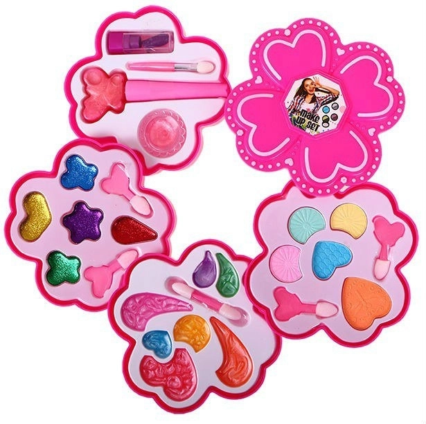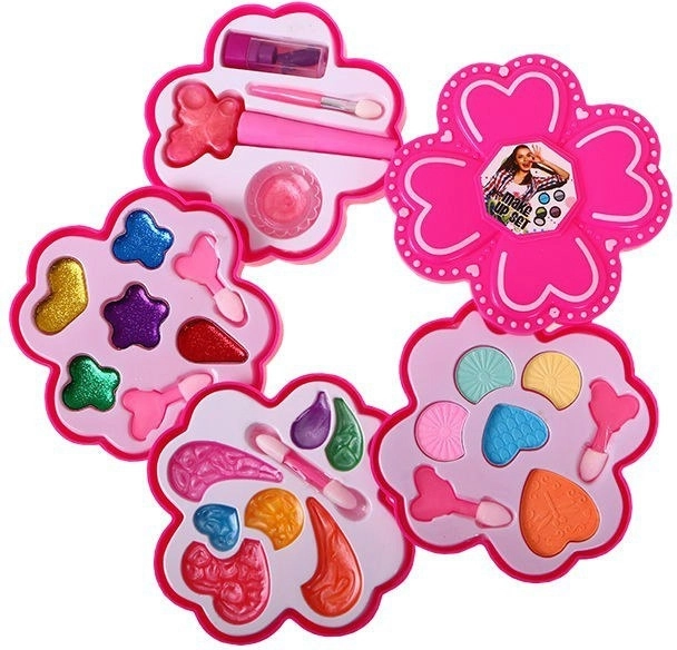 Uitklapbaar roze etui met kindermake-up voor kleine fashionista’s vanaf 3 jaar biedt veilige en creatieve pret. Bevat oogschaduw in verschillende texturen, lippenstift, lipgloss, nagellak en praktische applicators. Het compacte bloemenontwerp is perfect voor onderweg en als cadeau.