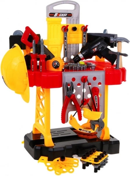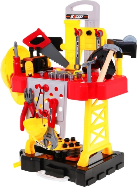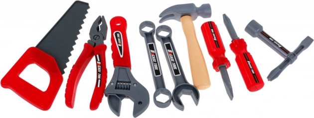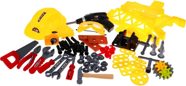 De set is rijk uitgerust: accuboormachine/schroevendraaier, hamer, bankschroef, zaag, tang, inbussleutels en steeksleutels, schroevendraaiers, schroeven, moeren, tandwielen, meetlint en werkstukken met schroefdraad voor eindeloos schroeven en monteren. Dankzij de slim ontworpen organisatie van het gereedschap oefenen kinderen orde, geduld en oog-handcoördinatie.