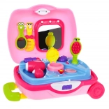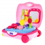 Inbegrepen zijn een grote en een kleine spiegel, een föhn, een kam, een borstel, “parfum” en “lippenstift” (decoratieve dummy’s). Na het spelen kan alles eenvoudig worden opgeborgen in het koffertje op wieltjes met uittrekbare handgreep – ideaal voor de kinderkamer en op reis.