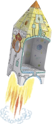 De raket heeft egale vlakken die klaar zijn voor kleurpotloden, stiften en verf. Kinderen maken hun eigen unieke design en kunnen daarna meteen op ruimtemissie gaan.