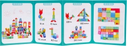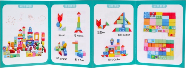 | - 100 houten blokken in verschillende kleuren en vormen, - geïllustreerde handleiding. | |