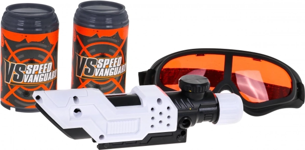 - Blaster, magazijn, 24 kogels, 2 doelen (blikjes), veiligheidsbril