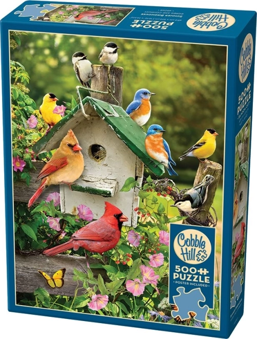Stijlvolle puzzel van COBBLE HILL met het motief Zomerhut, bestaande uit 500 stukjes met een niet‑traditionele stans en onregelmatige vormen, wat zorgt voor hogere moeilijkheidsgraad en langer puzzelplezier. In de doos zit een voorbeeldblad van 30,5 × 22,9 cm; het voltooide formaat is ca. 48,9 × 67,6 cm.