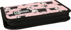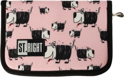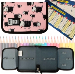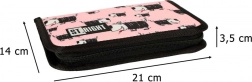 Praktische schooletui met twee kleppen in roze design met honden. Biedt een overzichtelijke indeling van schoolspullen, is afsluitbaar met rits en heeft een ergonomische ritstrekker. Binnenin vind je tussenschotten en elastische houders voor stiften, potloden en een liniaal; inbegrepen zijn ook een tafels-overzicht en lesrooster.