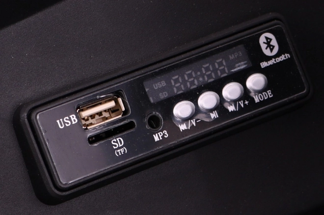 De bediening is eenvoudig – starten met een sleutel, rijden vooruit/achteruit en 3 vooruit-snelheden via een hendel. Het audiopaneel biedt Bluetooth, USB, MP3, SD, AUX, FM-radio en voorgeïnstalleerde melodieën. De praktische achterste opbergbox biedt plaats aan kleine spullen voor onderweg en de laadindicator herinnert aan oplaadtijd.