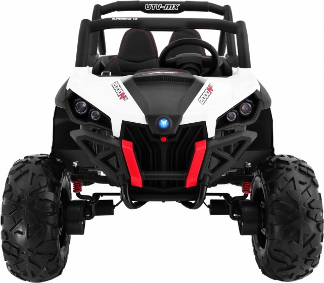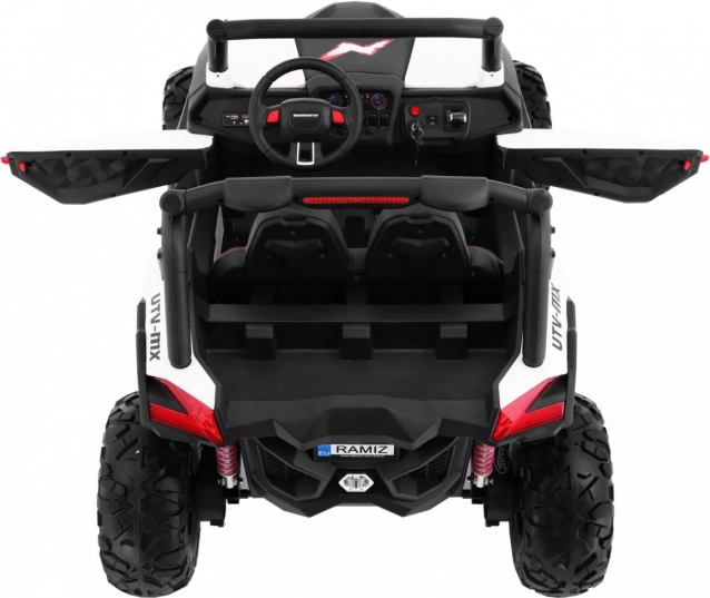 De veiligheid is in handen van de 2,4 GHz afstandsbediening met drie snelheden en noodstopfunctie STOP. Dankzij de schakelaar 2×4 / 4×4 pas je het vermogen aan op terrein en accuduur. LED-verlichting voor en achter verhoogt de zichtbaarheid en geeft de authentieke look van een echte UTV.