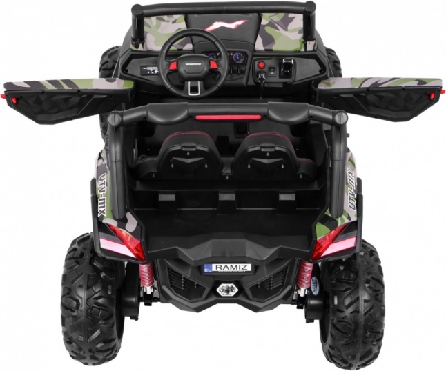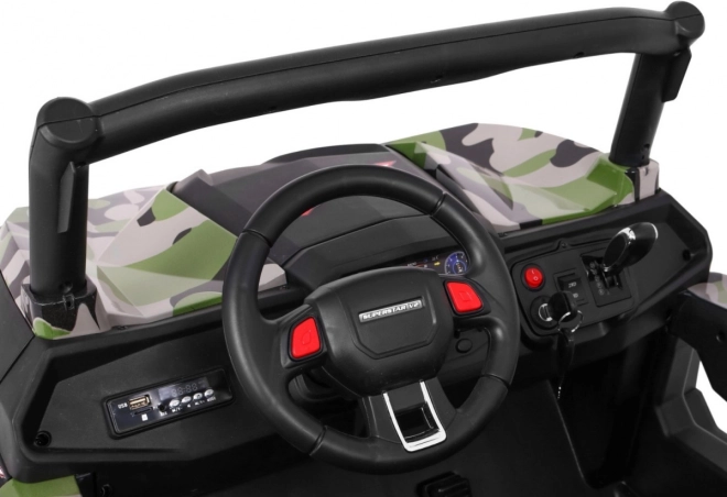 Het multimediapaneel biedt MP3, USB, SD, AUX, Bluetooth, FM-radio en vooraf geïnstalleerde melodieën. Verder aanwezig: start met sleutel, laadindicator, geluiden op het stuur en LED-lichten met schakelaar. Voor de veiligheid zorgen veiligheidsgordels en een 2,4 GHz ouderafstandsbediening met drie snelheden en STOP-knop.