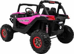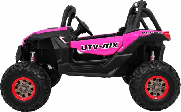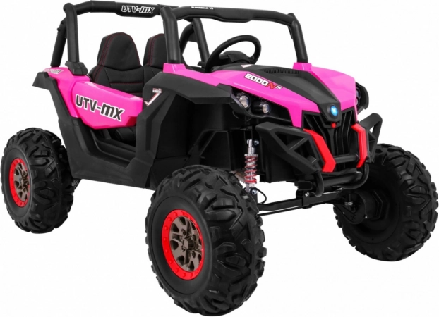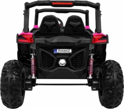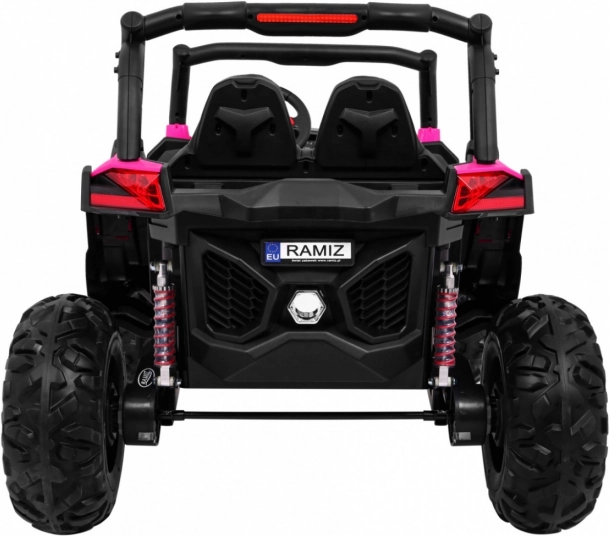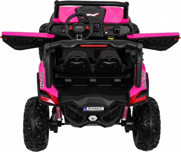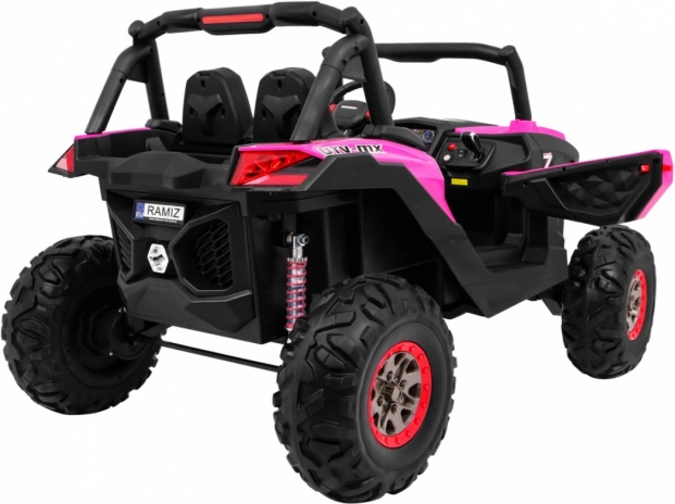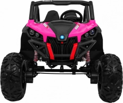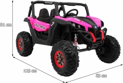 Ontdek avontuur met de elektrische kinderbuggy 4x4 in het roze – een robuust tweezits voertuig met schakelbare aandrijving 2x4/4x4, grote EVA-wielen en een rijke uitrusting. Dankzij de 2,4 GHz afstandsbediening met drie snelheden, het veilige Stop-knopje, de zachte eco-leren stoel en LED-lichteffecten biedt hij een veilige én leuke rit. Inclusief MP3/USB/SD/Bluetooth, FM-radio, te openen deuren met vergrendeling en een achterste opbergbox.