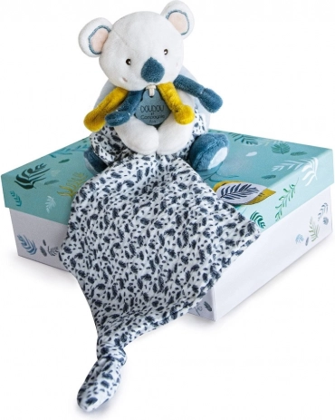 De schattige pluchen koala Yoca met knuffeldoekje verrukt je baby vanaf de geboorte en biedt zachtheid, comfort en een gevoel van geborgenheid. De set is verpakt in een elegante geschenkdoos, ideaal als kraamcadeau of voor Kerst. Gemaakt van premium, extra zacht pluche en conform de Europese CE-normen.