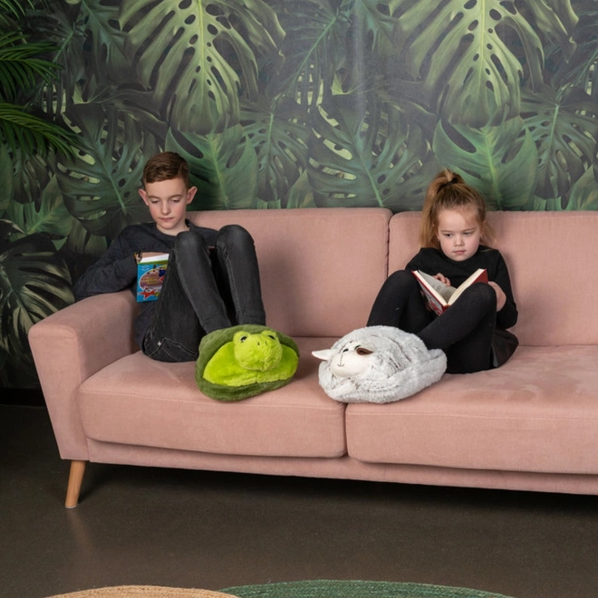 De oversized huiskpantoffel in de vorm van een schildpad is ontworpen voor maximaal comfort tijdens zitten en liggen. Dankzij de superzachte vulling en knusse binnenkant houdt hij je voeten warm zonder elektriciteit en zonder risico op verbranding. Ideaal voor tv-kijken, lezen, gamen of werken op de laptop.