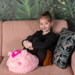 De stijlvolle roze eenhoorn met gekleurde hoorn verovert harten bij de eerste aanblik en maakt elke woonkamer of kinderkamer gezelliger.