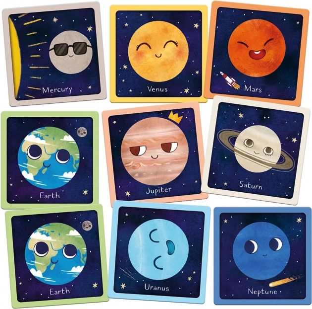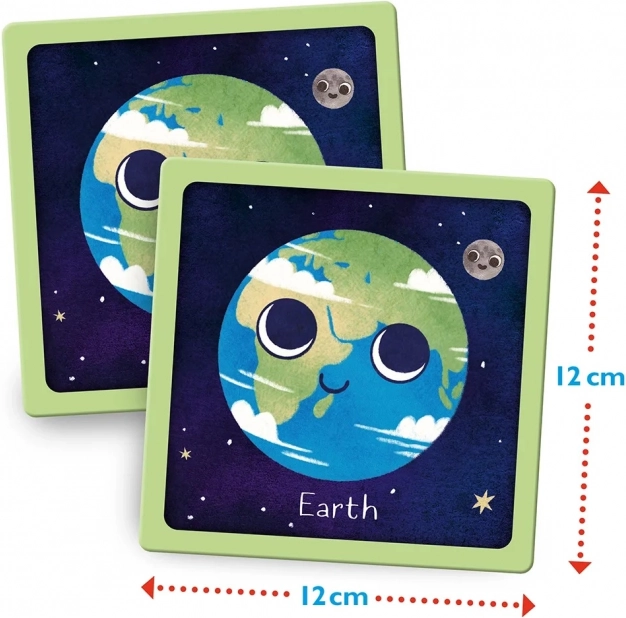 Educatief memoryspel Magellan Planeten met grote kaarten van 12×12 cm. Traineert geheugen en opmerkzaamheid bij kinderen vanaf 4 jaar en leert namen en volgorde van de planeten. 16 stukken.