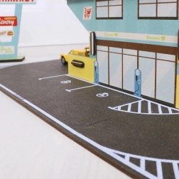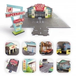 Met deze creatieve bouwset bouw je een supermarkt met burgerrestaurant, parkeerplaats, op- en afritten en aansluitende wegen. De onderdelen zijn eenvoudig te koppelen, blijven stevig zitten tijdens het spelen en bieden kinderen urenlang fantasierijden met auto’s. Kartonnen en houten componenten uit verantwoord gewonnen materialen zorgen voor duurzaamheid en milieuvriendelijkheid.