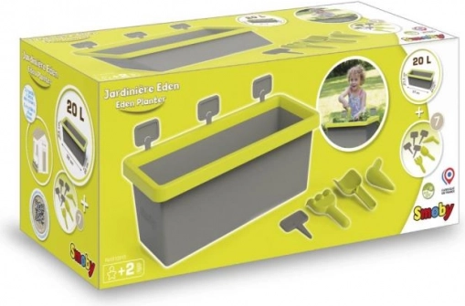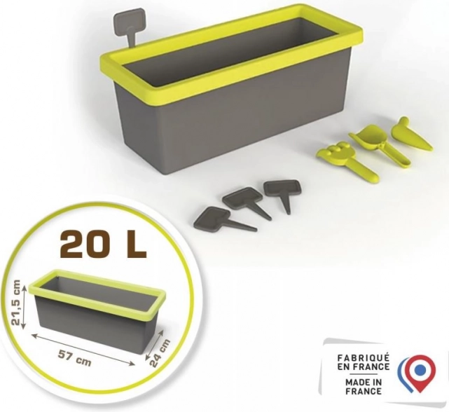 Bloembak voor bloemen of groenten, inhoud 20 liter. Inclusief 4 priklabels, uitsteker, handharkje en schepje. Zone voor waterretentie; de bodem kan naar behoefte worden doorboord. Afmetingen van de bloembak: 59 x 21,5 x 24 cm.