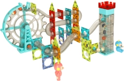 Deze kleurrijke magnetische bouwset laat kinderen stabiele torens, tunnels en 3D-constructies bouwen terwijl ze zien hoe knikkers door transparante buizen en hellingen rollen. De module met het draaiwiel en de lift houdt de knikkers in beweging, terwijl het geluidselement een vrolijke melodie aan het spel toevoegt. De onderdelen zijn gemaakt van duurzaam, transparant plastic met magneten die snel en creatief bouwen mogelijk maken.