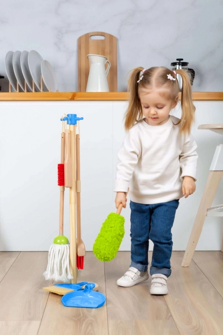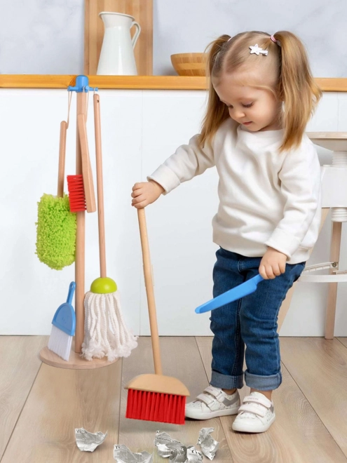 Deze set bevat kleurrijke speelinstrumenten, waaronder een bezem, een mop en een plumeau, wat de visuele en speelervaring van kinderen vergroot.