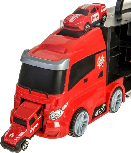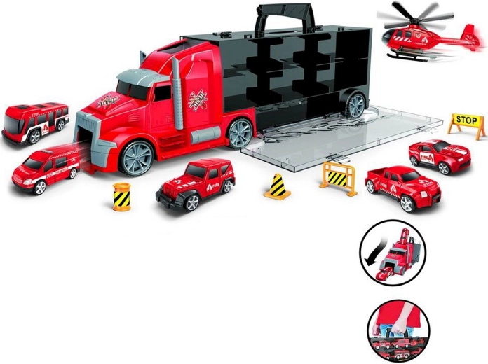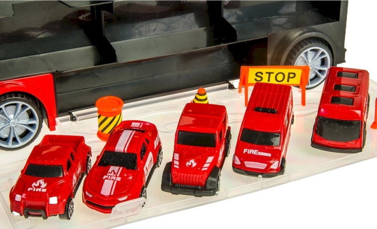 Ontdek de leuke brandweertransporter met een praktisch koffertje voor autootjes, dat dient als draagbare parkeerplaats en als startschans voor actie. In de set vind je 5 autootjes en een helikopter, samen met verkeerskegels en borden voor realistisch spel. Het afsluitbare koffertje met een comfortabele handgreep maakt opbergen en meenemen eenvoudig – ideaal voor onderweg en thuis.