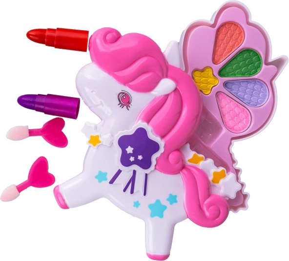 Schattige kinder make-upset in de vorm van een eenhoorn met kleurrijke oogschaduws en een rode lipstick voor kleine beautyliefhebbers. Het compacte design met uitklapbare vleugels past gemakkelijk in de handtas en stimuleert creatief rollenspel met make-up.