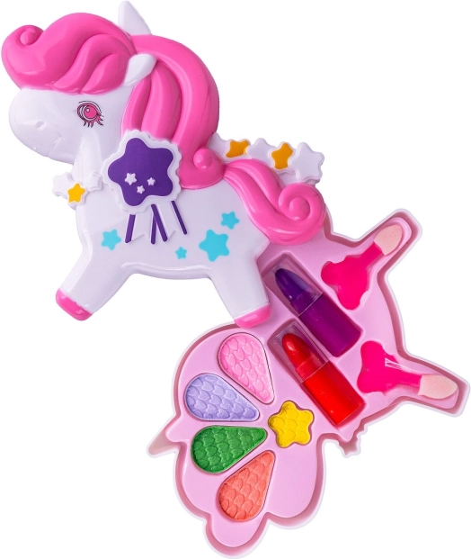 Deze betoverende make-upset in de vorm van een eenhoorn is ideaal voor de eerste stapjes in make-up. Kinderen genieten van veilig en leuk spel dat verbeelding en fijne motoriek stimuleert. De uitklapbare vleugels onthullen een palet met levendige oogschaduws en er is ook een lipstick voor een vleugje kleur op de lippen.