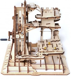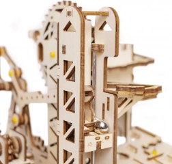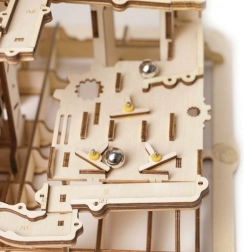 Het model bevat een torenverdeler, spiraalhellingen, kraan- en wiellift, een korte glijbaan en slim geplaatste schakelaars die de route van de knikkers veranderen. De moeilijkheidsgraad is 4/5; montage duurt ongeveer 6–7 uur. Na voltooiing hoef je alleen aan de hendel te draaien en je mee te laten voeren door het dynamische schouwspel dat de principes van STEM tastbaar maakt.