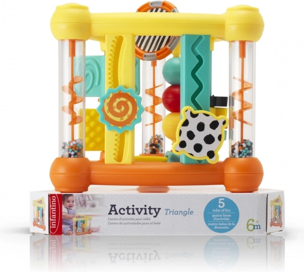 Actief driehoekig speelcentrum met veel elementen: verschillende vormen, kralen en knoppen. Geschikt om binnen en buiten mee te spelen. De driehoekige vorm van het speelgoed maakt het gemakkelijk om mee te nemen en te verplaatsen. Aan elke zijde is er ander speelplezier.