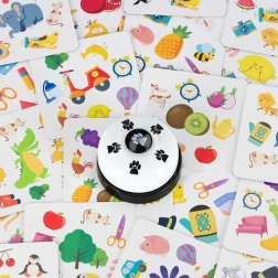 - Hoe te spelen (voorbeeld): Elke speler neemt één kaart, leg de stapel op tafel. Draai de bovenste kaart van de stapel om en zoek het gemeenschappelijke plaatje met jouw kaart. Wie het eerst vindt, rinkelt en neemt de kaart op zijn/haar stapel. Ga door tot de stapel op is.